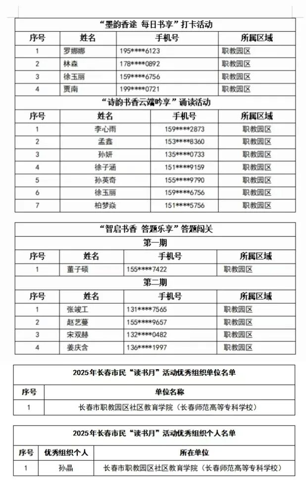 为深入贯彻落实第十四届全国人民代表大会第三次会议关于“深化全民阅读活动”的重要部署,我校积极响应《关于开展2025年长春市民“读书月”活动的通知》,全校师生踊跃参与,凭借高效的组织推进与师生的出色表现,经严格评审,我校获评“优秀组织单位”;16名学生获线上活动个人奖项;1名教师被授予“优秀组织个人”称号,在全民阅读热潮中交出亮眼答卷。
