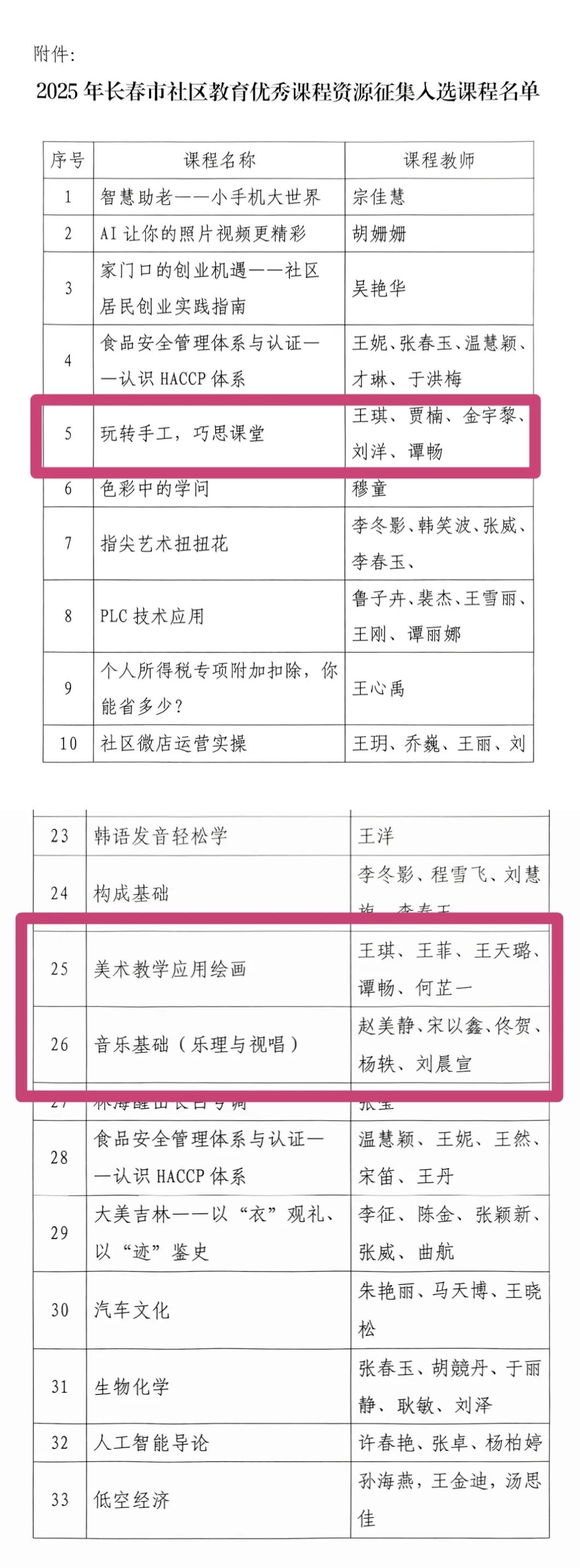 为深入贯彻落实党的二十届四中全会精神,推动长春市优质社区教育资源共建共享,长春开放大学(长春社区大学)组织开展了2025年长春市社区教育优秀课程资源征集活动。经各院校申报、县(市)区推荐、专家评审及结果公示等程序,我校申报的《玩转手工,巧思课堂》《美术教学应用绘画》《音乐基础(乐理与视唱)》三项数字课程资源成功入选“2025年长春市社区教育优秀课程资源库”,并获长春开放大学(长春社区大学)颁发荣誉证书。