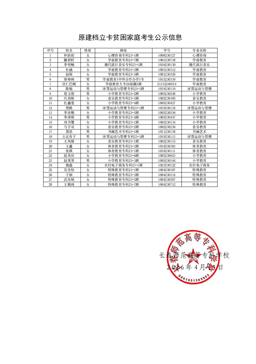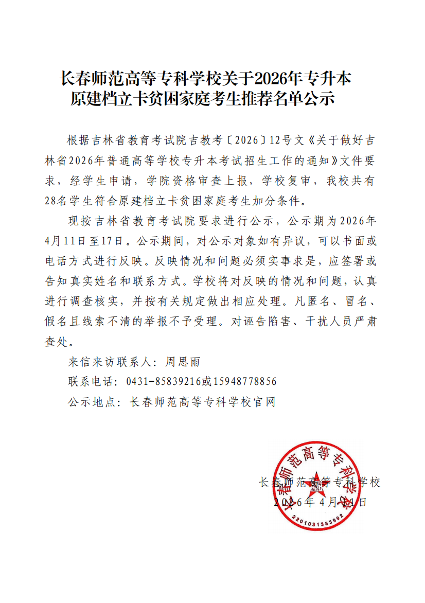 长春师范高等专科学校关于2026年专升本原建档立卡贫困家庭考生推荐名单公示