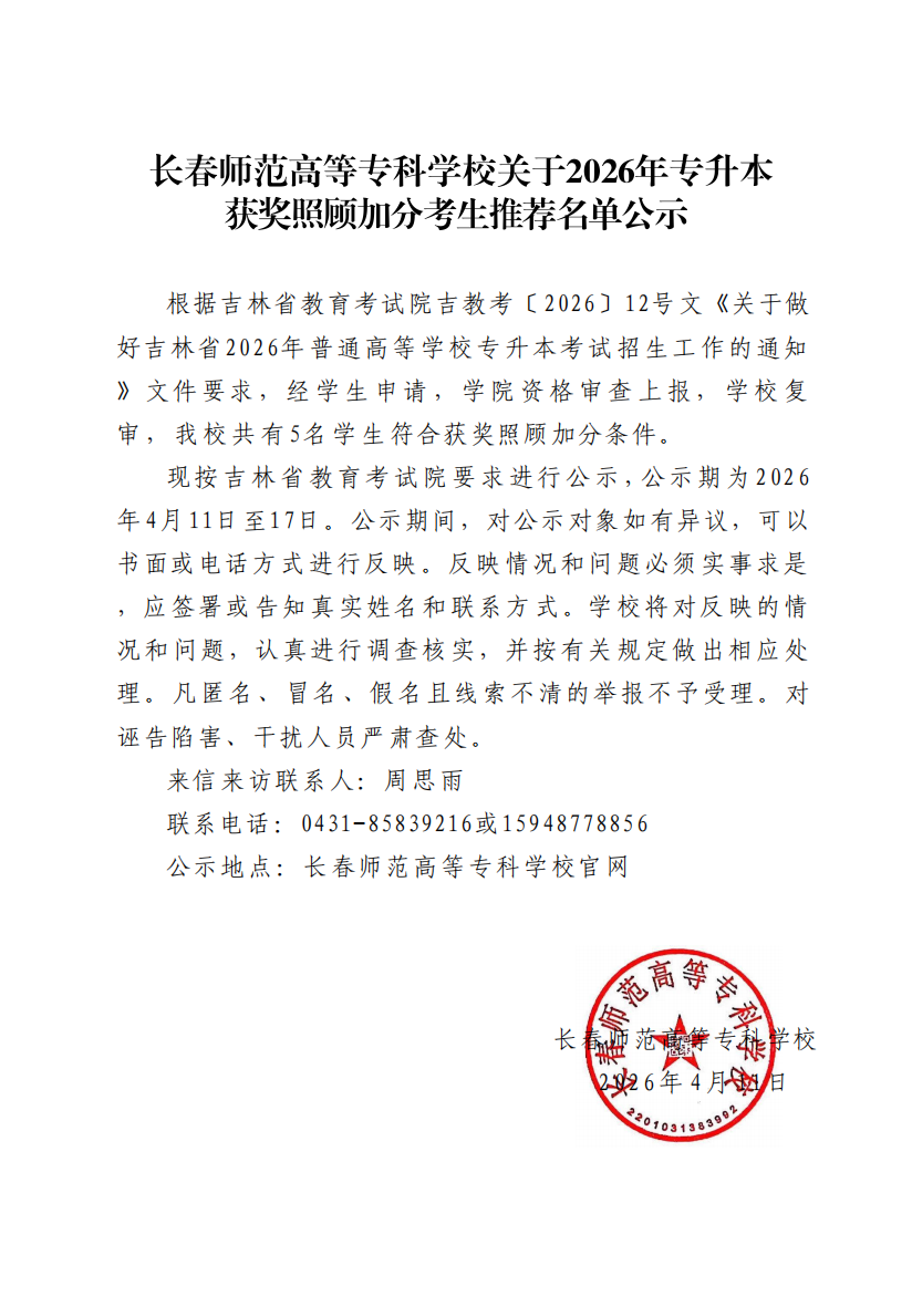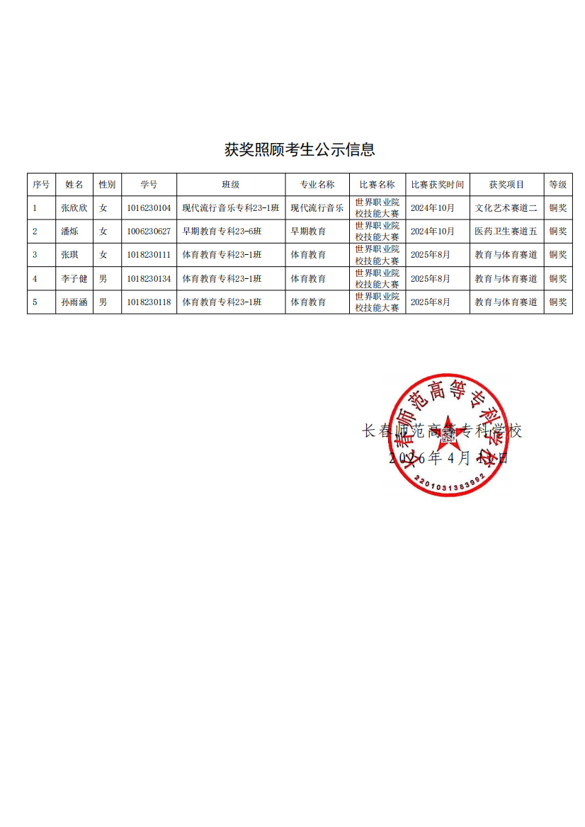 长春师范高等专科学校关于2026年专升本获奖照顾加分考生推荐名单公示